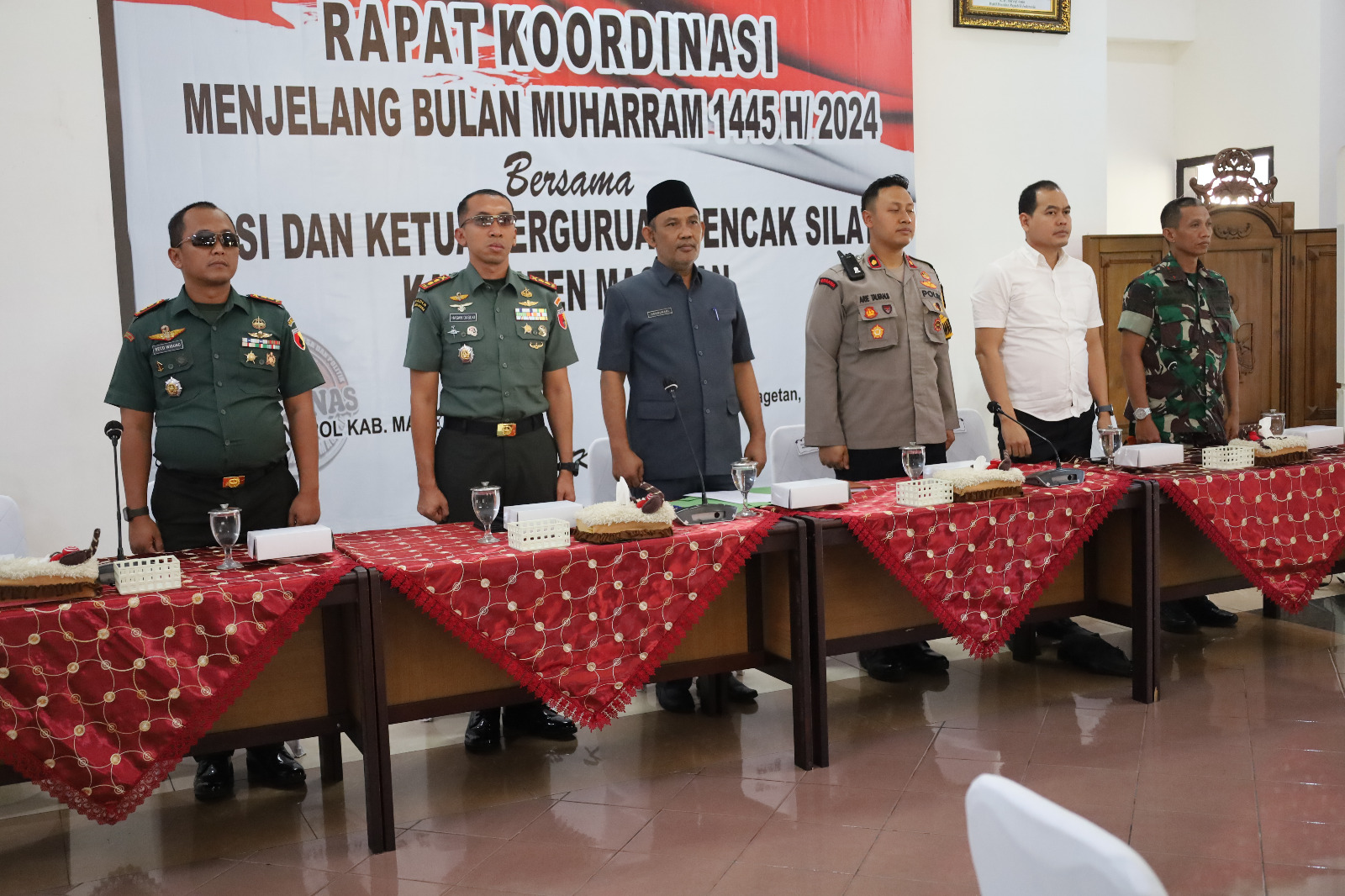 Rapat Koordinasi Pencegahan dan Kewaspadaan Konflik Jelang Muharram 1445 H/2024 merupakan langkah penting dalam menjamin perayaan Muharram di Kabupaten Magetan berlangsung damai dan aman. Pertemuan tersebut mempertemukan para pemangku kepentingan utama dari militer, polisi, pemerintah, dan komunitas pencak silat untuk membahas dan mengordinasikan upaya mereka untuk mencegah konflik dan menjaga keamanan. Pertemuan tersebut juga menjadi pengingat akan pentingnya saling menghormati dan toleransi pada hari raya keagamaan yang penting ini. (MC0804)