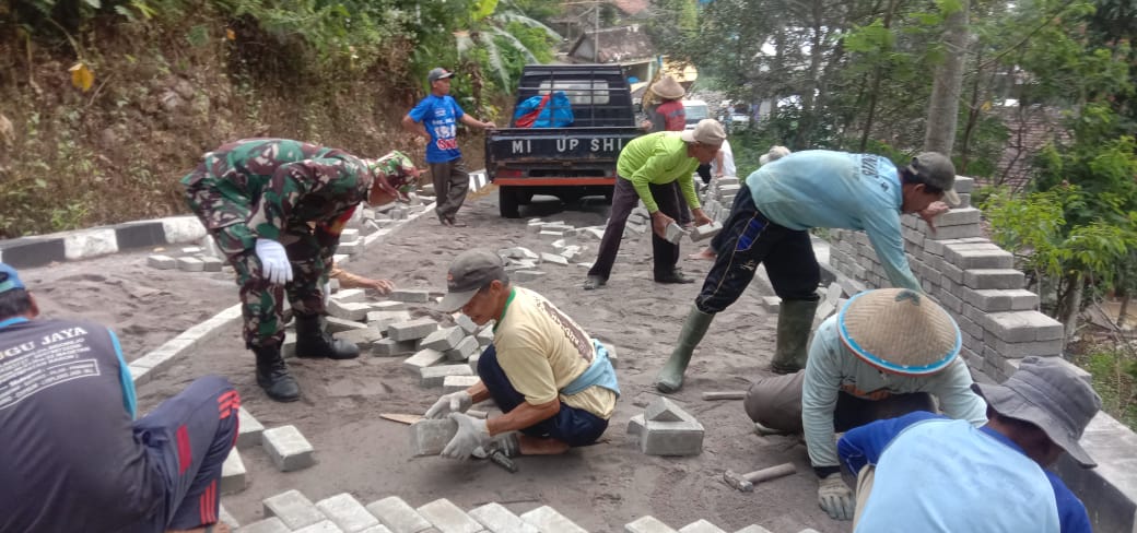 Magetan. – Babinsa Koramil tipe B 0804/02 Plaosan Sertu Ali Lukman Bersama masyarakat binaan gotong royong membantu warga melaksanakan pemasangan paving jalan di Desa Plumpung, Kecamatan Plaosan, Kabupaten Magetan. Jumat (14/06/2024)