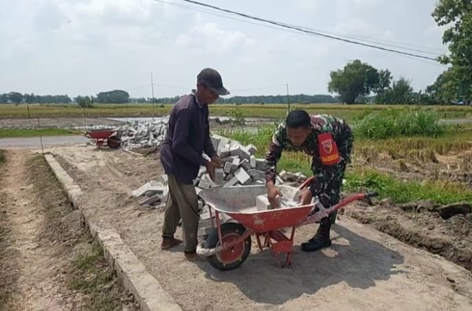 Magetan. – Bersama masyarakat warga binaan Babinsa Koramil tipe B 0804/08 Barat Serda gutoyo gotong royong membantu warga melaksanakan pemasangan paving jalan di Desa Rejomulyo Kecamatan barat, Kabupaten Magetan. Pada Senin (03/05/2024).