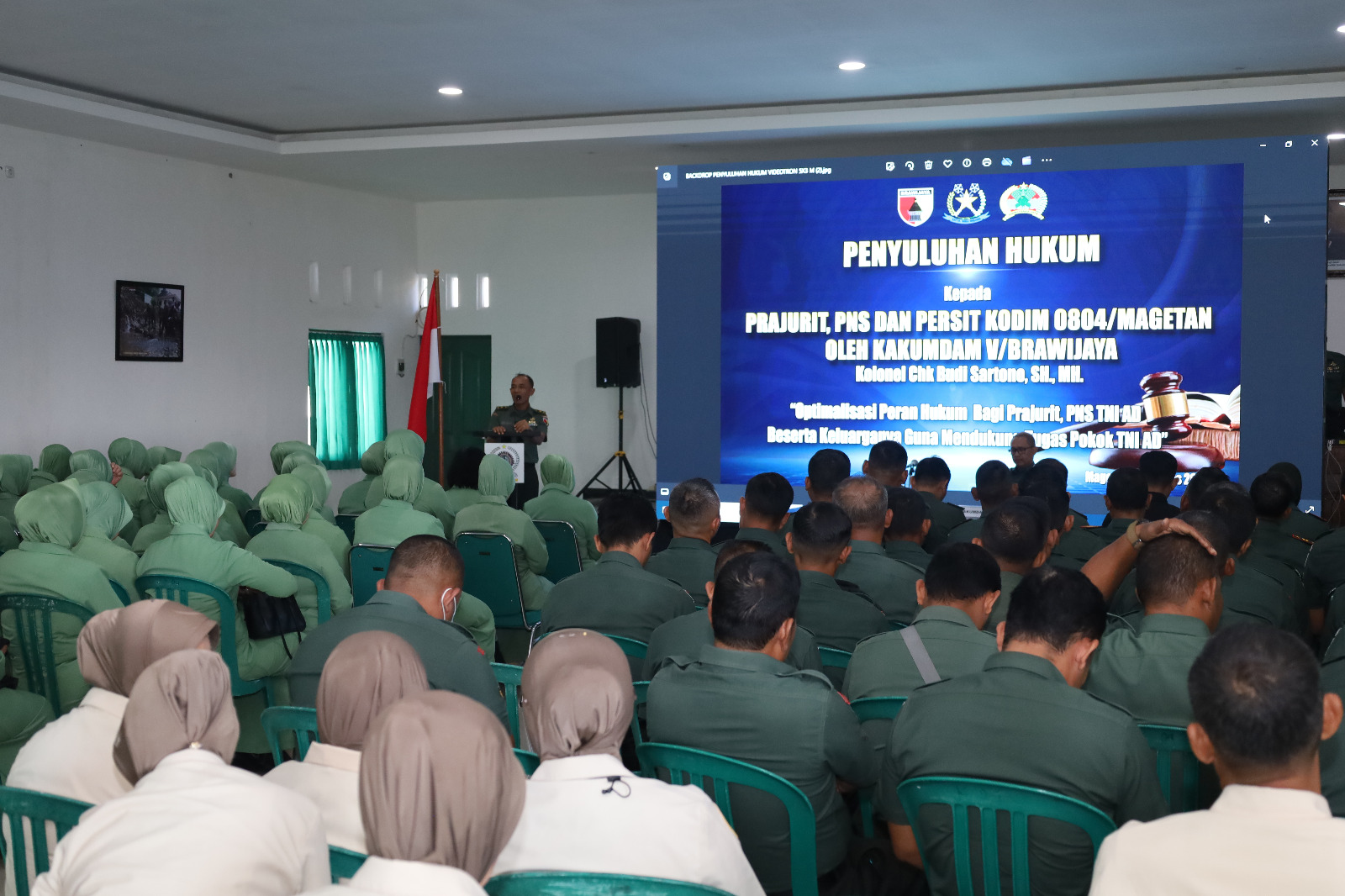 Penyuluhan hukum ini bertujuan untuk memberikan pengetahuan dan pemahaman tentang hukum kepada prajurit, PNS, dan Persit Kodim 0804/Magetan. Materi yang disampaikan meliputi berbagai aspek hukum, seperti hukum pidana militer, hukum disiplin militer dan hukum keluarga.