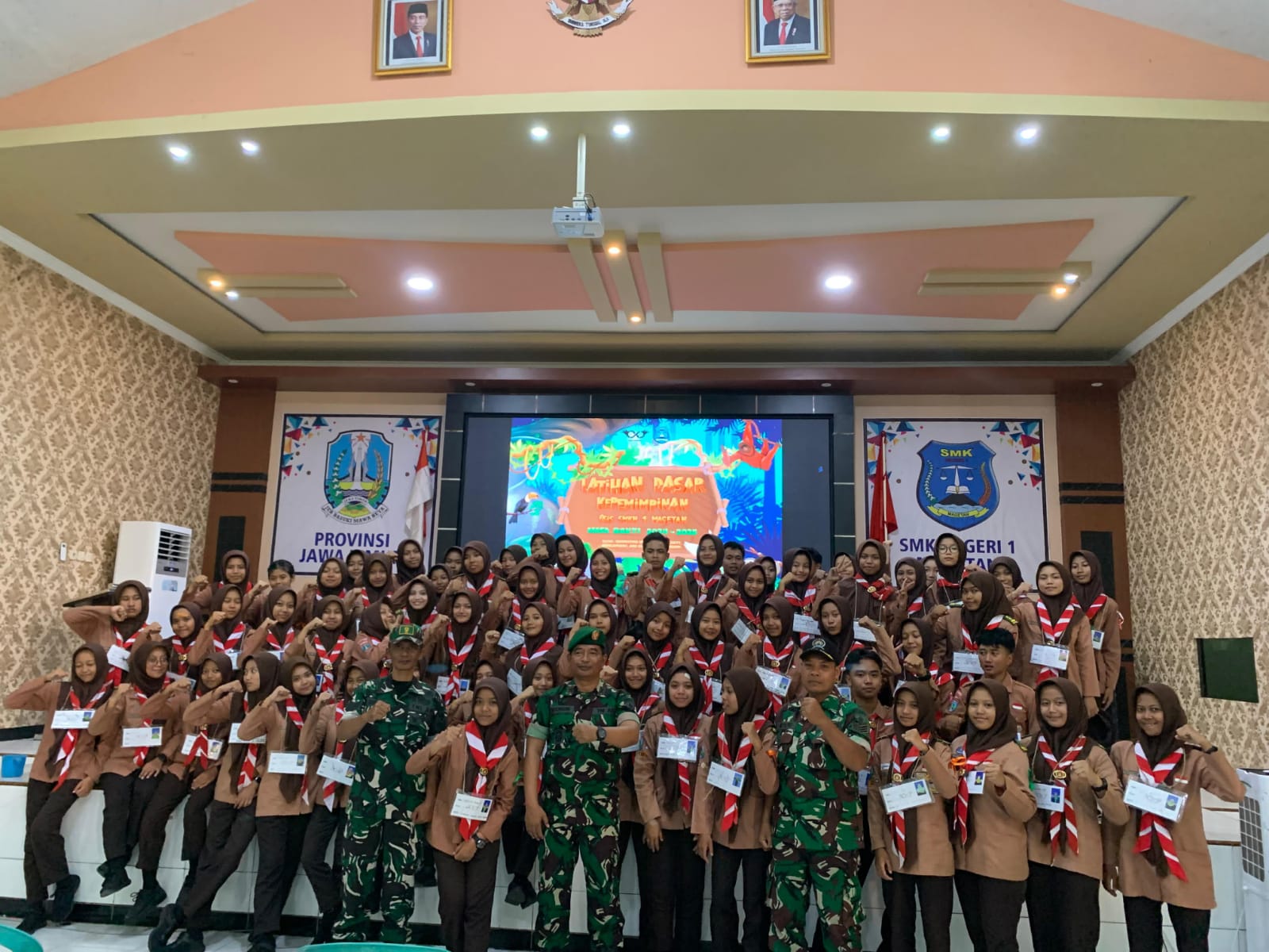 Magetan. Komandan Koramil 0804/01 Magetan Kodim 0804 Magetan Kapten Arm Khoirudin berikan materi wawasan kebangsaan dan PBB dalam rangka Latihan Dasar Kepemimpinan SMKN 1 Magetan yang di ikuti sekitar 82 siswa-siswi bertempat di Aula SMKN 1 Magetan. Jum’at (11/10/2024)