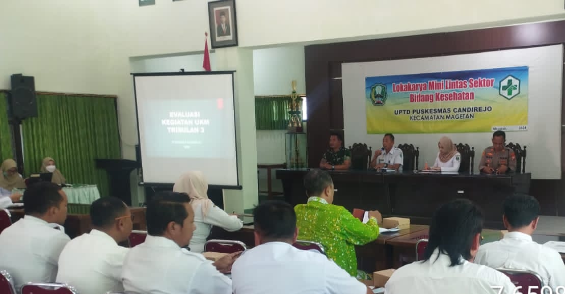 Hadir kegiatan loka karya mini lintas sektor Bidang Kesehatan di wilayah kerja UPTD Puskesmas Candirejo antara lain Camat Magetan Yudo Wahyono, S.Sos, M.Si,Danramil Tipe B 0804/01 Magetan Kapten Arm Khoirudin,Kapolsek Magetan AKP Ika Wardani, S.H,Kepala UPTD Puskesmas Candirejo dr. Diana Etikawati,Sekcam Magetan Wiwik Sumaryati, ST, MM,Kepala KUA Kecamatan Magetan Wagimun, S.Ag,Badan penyuluh pertanian Ibu Anita,Koordinator penyuluh lapangan KB Kec. Magetan Ibu Aminatus Solehah, S.Sos,Kepala Desa/Kelurahan Sekecamatan Magetan,Pendamping Kec. Magetan,ASN Puskesmas Candirejo, Ibu ketua TP PKK Desa/Kelurahan Sekecamatan Magetan.