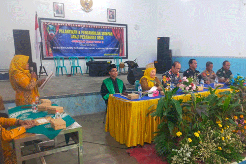 Magetan. – Mewakili Danramil, Bati Tuud Koramil Tipe B 0804/08 Barat jajaran Kodim 0804/Magetan Serma Suwandi turut serta menghadiri acara Pelantikan dan pengambilan sumpah perangkat Desa bagian Kepala dusun, di aula kantor Desa Manjung Kecamatan Barat, Kabupaten Magetan. Rabu (23/10/24)