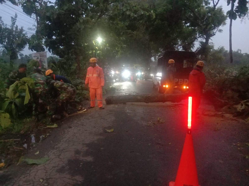 Magetan.kodim-magetan.com.- Hujan deras disertai angin kencang menyebabkan pohon Jati tumbang di jalur jalan raya Karas-Karangrejo tepatnya di Ds. Jungke Kec. Karas Kab. Magetan, Kamis Sore (14/11/2024).
