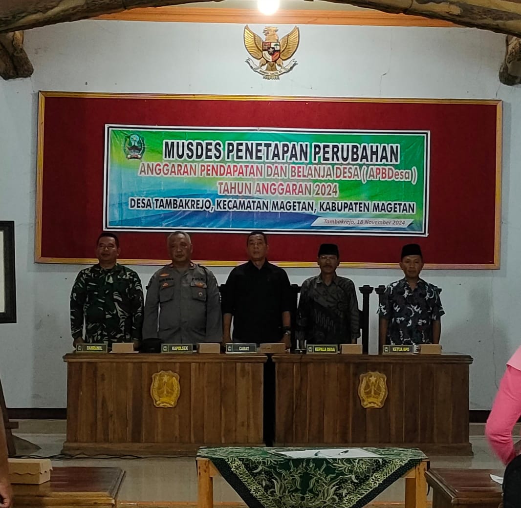 Kegiatan penetapan Perubahan Anggaran Pendapatan dan Belanja Desa (PAPB Des) Tahun anggaran 2024 Desa Tambakrejo tersebut dihadiri oleh Camat Magetan Yudo Wahyono, S.Sos, M.Si, Danramil Tipe B 0804/01 Magetan Kapten Arm Khoirudin, Kapolsek Magetan diwakili Wakapolsek Iptu Agus Rudi Kuncoro, Sekcam Magetan Wiwik Sumaryati, S.T., M.M, Ketua BPD diwakili Bpk. Sadino, Kades Tambakrejo Bpk. Widji, Babinsa Desa Tambakrejo Serka Rubangi, Bhabinkamtibmas Desa Tambakrejo Bripka Boerhan, Perangkat Desa Tambakrejo, Toga dan Tomas Desa Tambakrejo, Ketua RT/RW Desa Tambakrejo.
