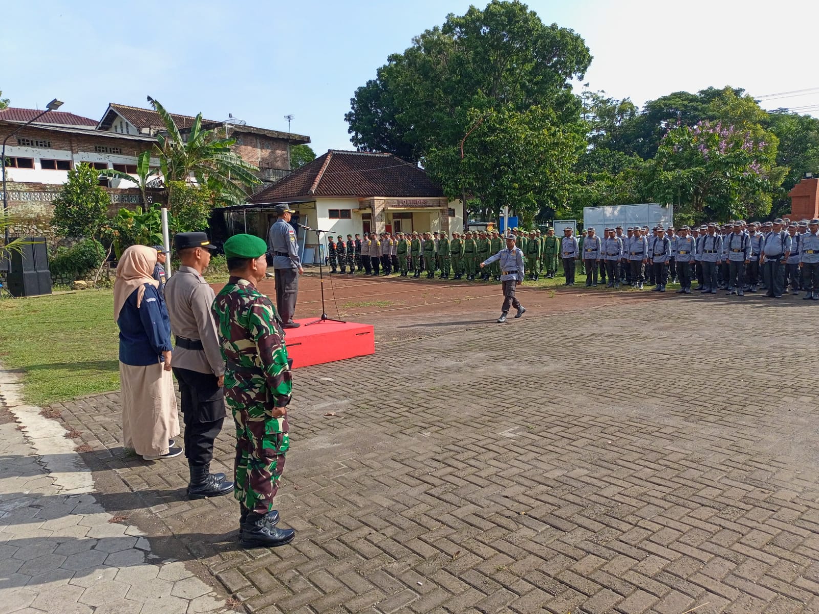 Magetan. Danramil 0804/01 Magetan Kapten Arm Khoirudin bersama Forkopimca Magetan menghadiri pelaksanaan apel gelar pasukan Linmas se-Kecamatan Magetan dalam rangka kesiapan pengamanan tahapan pemungutan suara Pemilihan Gubernur dan Wakil Gubernur, Bupati dan Wakil Bupati Kabupaten Magetan tahun 2024 bertempat di lapangan Kelurahan Tawanganom Kecamatan Magetan Kabupaten Magetan.