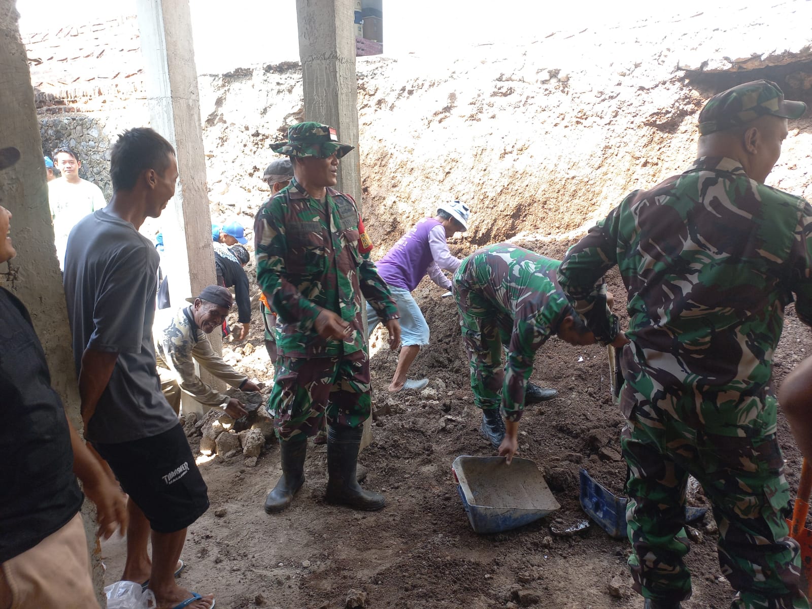 Anggota Posramil Ngariboyo, BPBD serta warga saling bahu-membahu membersihkan rumah warga korban dari talud yang longsor saat hujan deras. Pekerjaan pun menjadi lebih ringan dan cepat selesai karena dikerjakan bersama-sama.