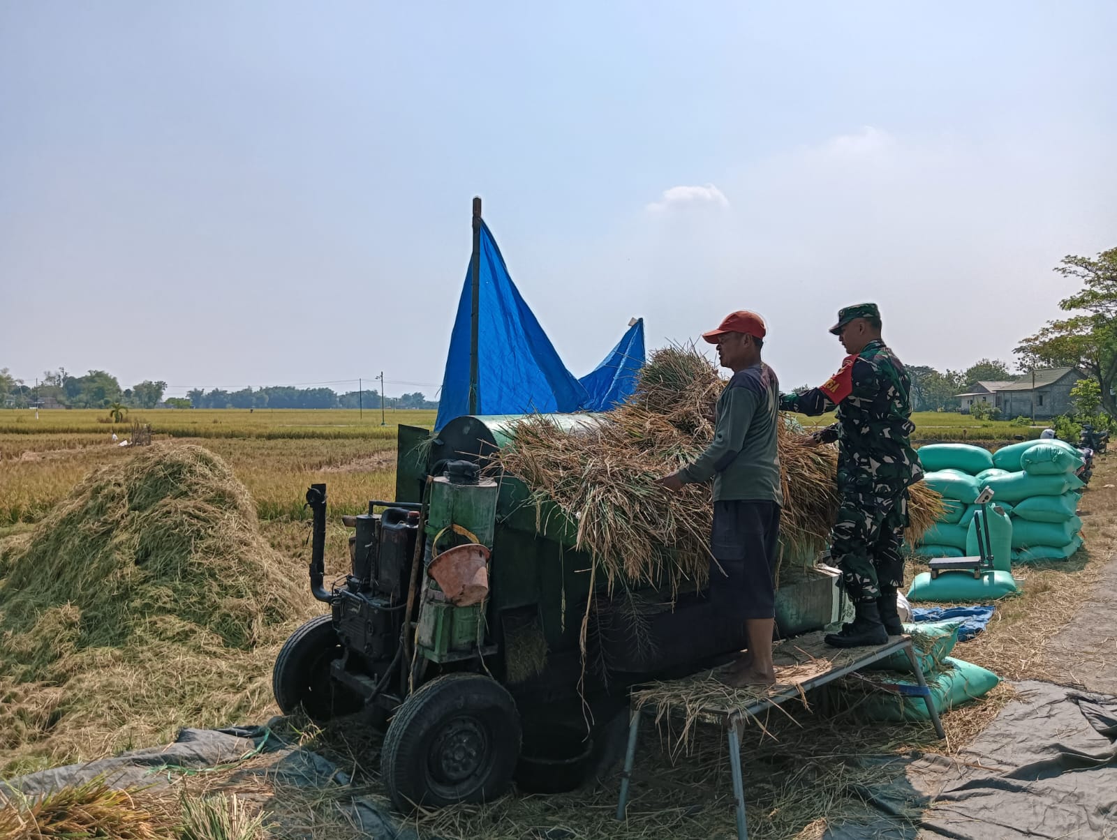 Babinsa dalam mendukung Ketahanan Pangan (Hanpangan) dengan semangat ikut serta terjun langsung ke sawah untuk membantu para petani desa binaannya saat memanen padi agar supaya terwujud kemanunggalan TNI dengan Rakyat.