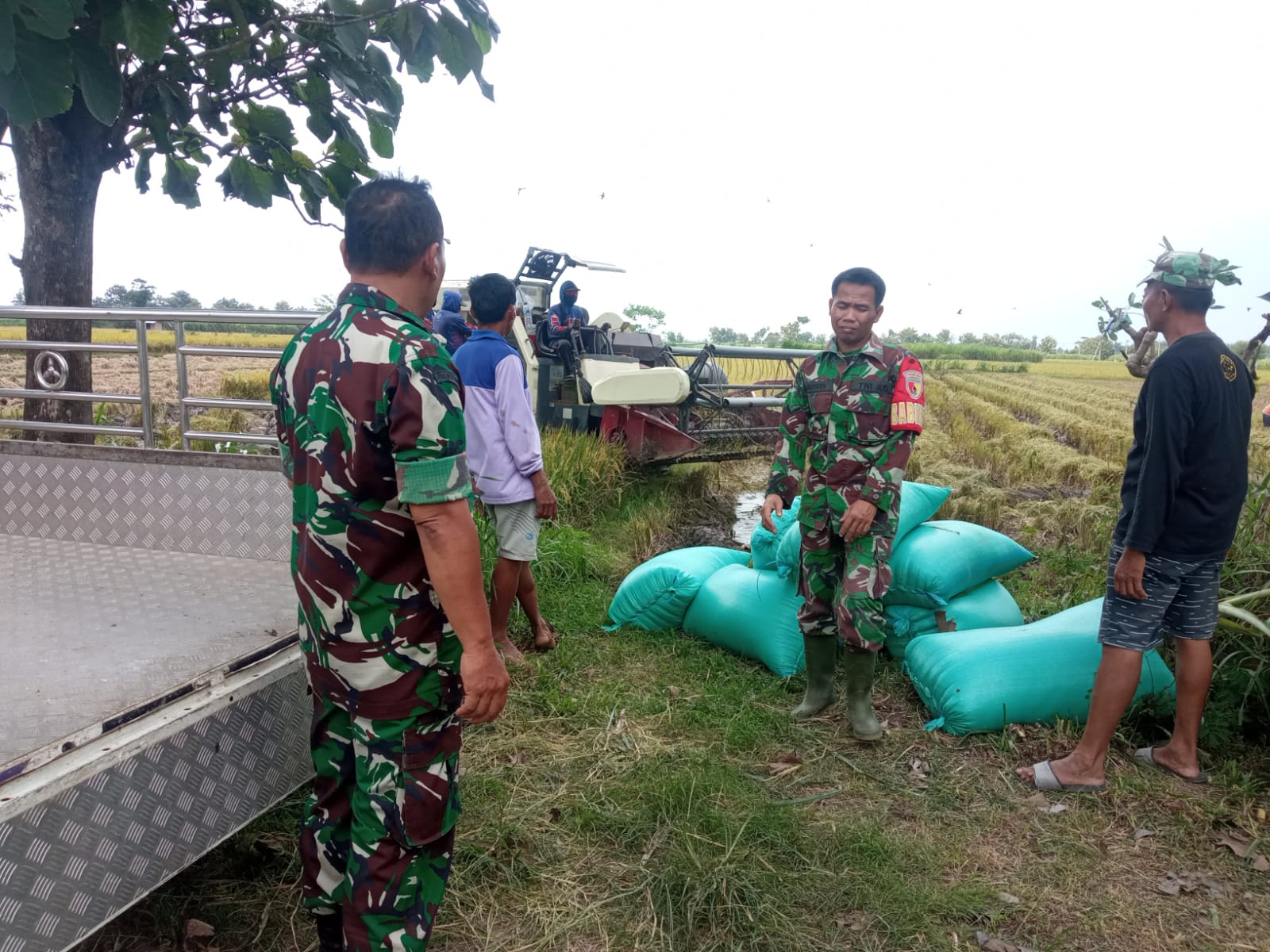 Danramil 13 Bendo Kapten Inf Arif, Wibowo beserta anggota Koramil mendampingi petani yang ada di wilayah dan langsung memandu tim Satker Sergap dari Bulog Kec. Maospati Bp. Giyanto di sawah yang sedang panen padi.