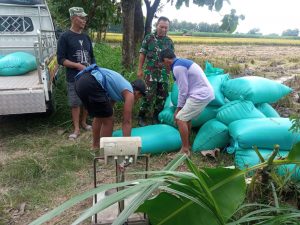 Danramil 13 Bendo Kapten Inf Arif, Wibowo beserta anggota Koramil mendampingi petani yang ada di wilayah dan langsung memandu tim Satker Sergap dari Bulog Kec. Maospati Bp. Giyanto di sawah yang sedang panen padi.