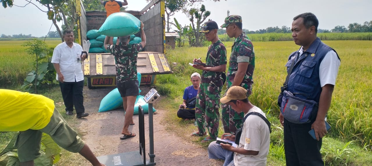 Magetan. – Babinsa Koramil 0804/13 Bendo Sertu Tri Agung beserta PPL kec. Bendo Bp. Suryono Dampingi Petugas Bulog sentral penggilingan padi Maospati terjun langsung ke lokasi panen di area sawah Desa Kinandang kecamatan Bendo Kab. Magetan melaksanakan serapan gabah petani (Sergab) milik petani anggota kelompok tani Tunas baru II desa Kinandang, kecamatan Bendo kabupaten Magetan. Senin (14/04/2025)