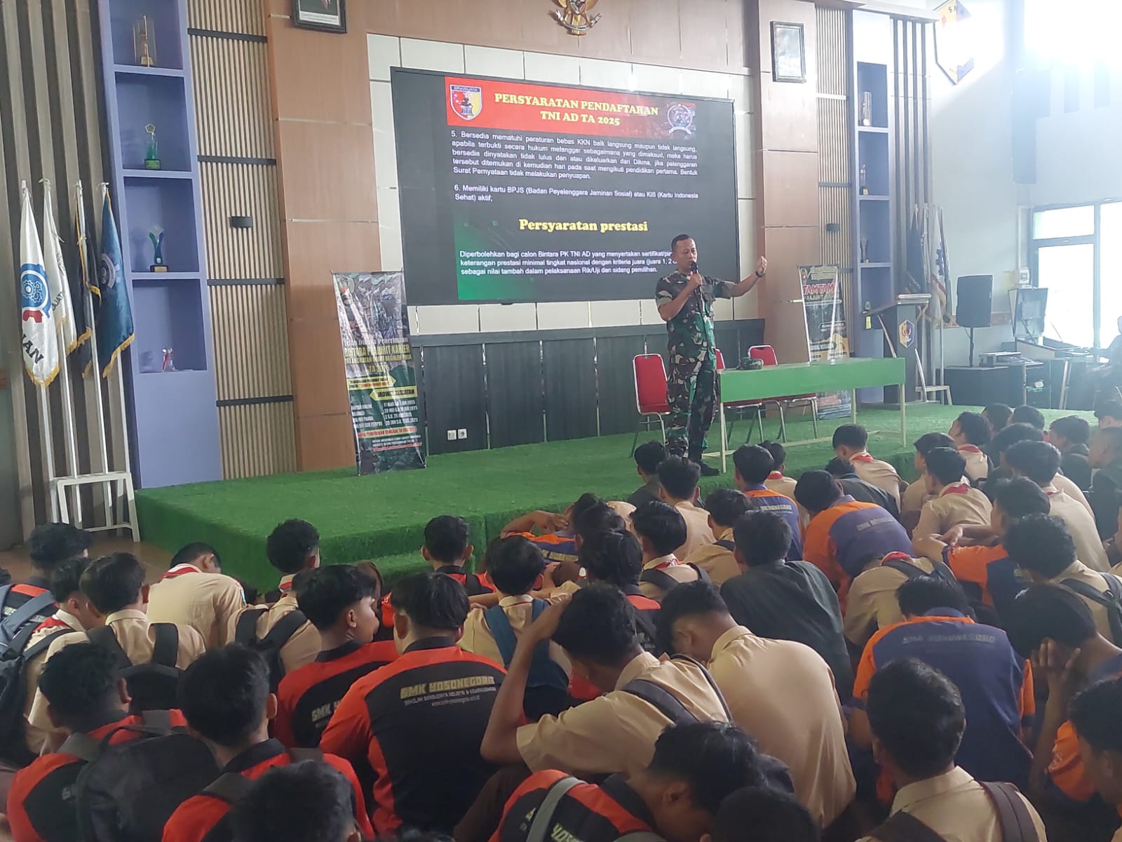 Hadir dalam kegiatan Sosialisasi Penerimaan Bintara PK Dan Tamtama PK GEL II TNI – AD Ta 2025. Kepada siswa kelas 12 SMK YOSONEGORO Magetan tersebut antara lain Kepala Sekolah SMK Yosonegoro Magetan Bpk Muh Amin, S. Ag, Komandan Koramil Tipe B 0804/01 Magetan Kapten Caj Jemani berserta 4 orang anggota, Bapak dan Ibu Guru SMK yosonegoro Magetan, Siswa – siswi kelas 12 SMK Yosonegoro Magetan.