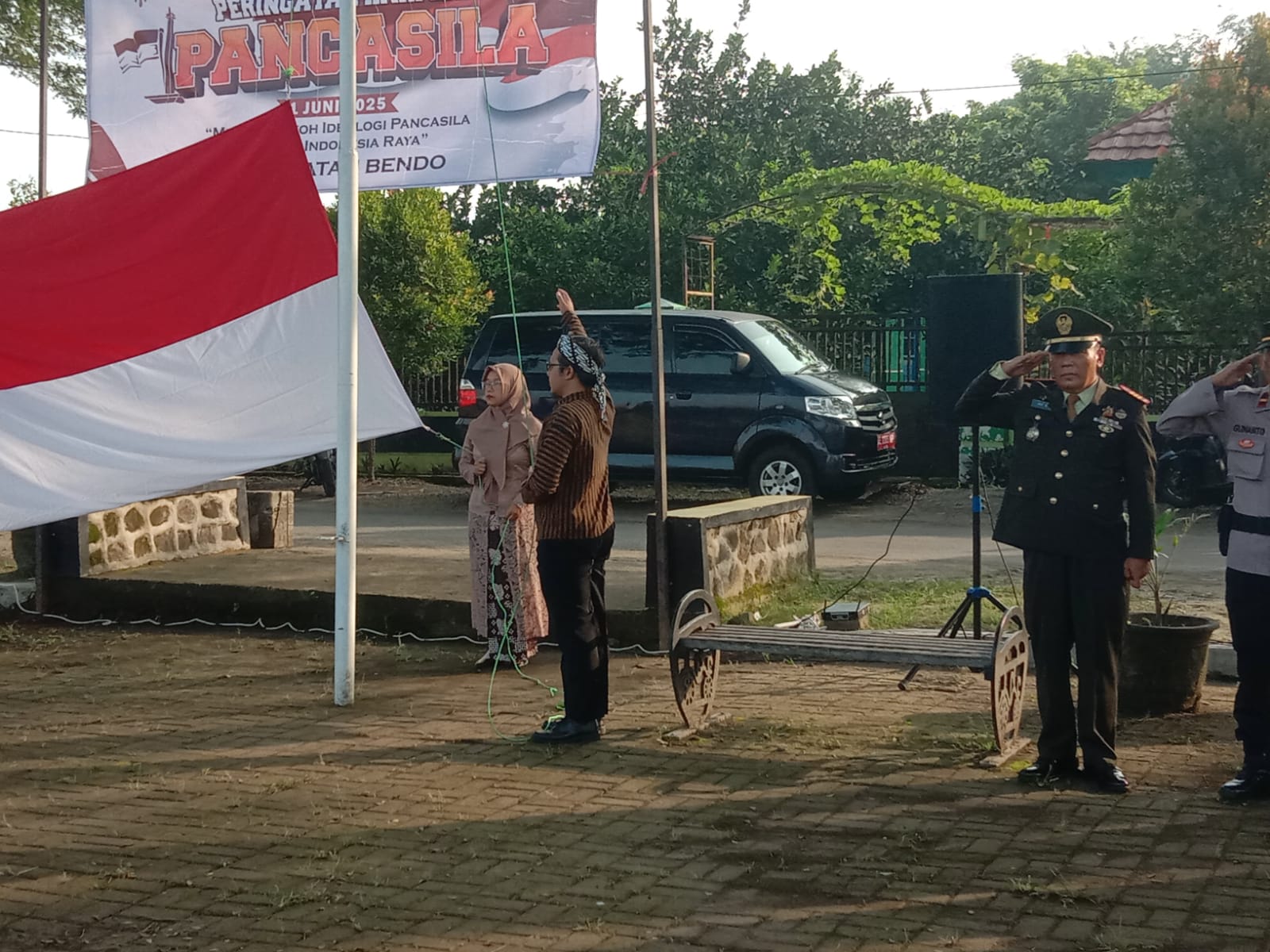 Magetan – Danramil 0804/13 Bendo Kapten Inf Arif Wibowo bersama Forkopimca Mengikuti Upacara Hari Lahirnya Pancasila di RTH lapangan Kelurahan Bendo dan dilanjutkan mengikuti Virtual YouTube BPIP di Aula Kantor BPP Kec. Bendo, Kabupaten Magetan. Senin (02/06/2025)