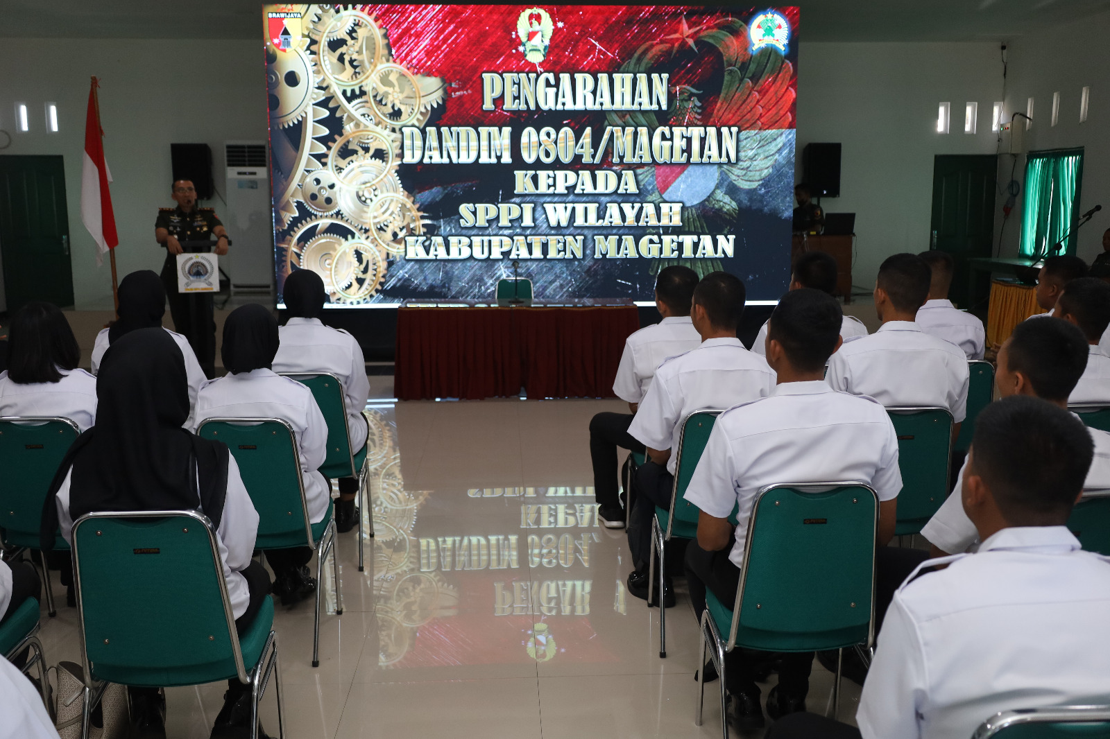 Magetan. Komandan Kodim 0804/Magetan, Letkol Inf Hasan Dasuki, S.Sos., M.I.P., memberikan arahan kepada lulusan Sarjana Penggerak Pembangunan Indonesia (SPPI) dalam kegiatan pembekalan yang berlangsung di Aula Makodim 0804/Magetan. Senin (21/07/2025)