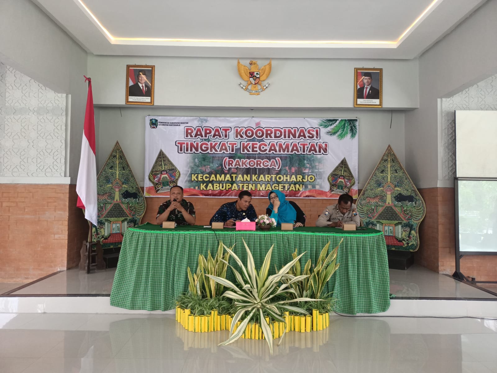 Kegiatan Rapat Kecamatan tersebut dihadiri oleh Plt Camat Kartoharjo Dicong maleleh S.STP.M.Si, Kapolsek AKP Eko Supriyanto S.H diwakili Kanit Binmas Aiptu Yuli Antariksa, Danpos Kartoharjo Koramil Tipe B 0804/08 Barat Peltu Nanang B.S, Kades, kadin wilayah kecamatan Kartoharjo ini momen yang penting untuk mewujudkan Kecamatan Kartoharjo yang kondusif, aman serta masyarakat sejahtera.