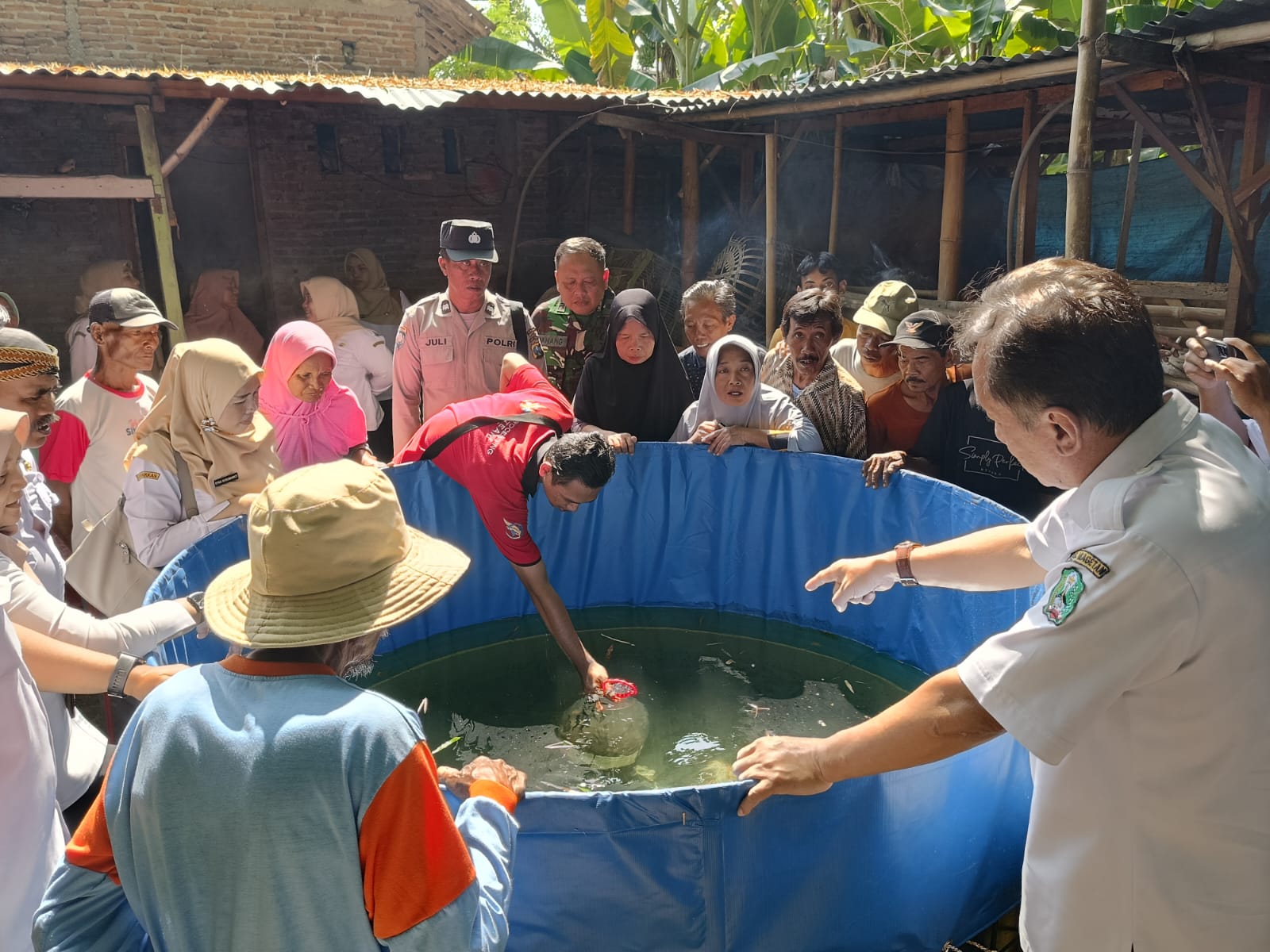 Magetan – Danpos Kartoharjo Koramil 0804/08 Barat Jajaran Kodim 0804/Magetan Peltu Nanang B.S memastikan penyerahan bantuan paket budidaya ikan air tawar dan Sarana prasarananya oleh Dinas Perternakan dan Perikanan tepat sasaran kepada kelompok pembudidaya di Desa Bayemwetan Kecamatan Kartoharjo Kabupaten Magetan, Rabu (2/7/25)