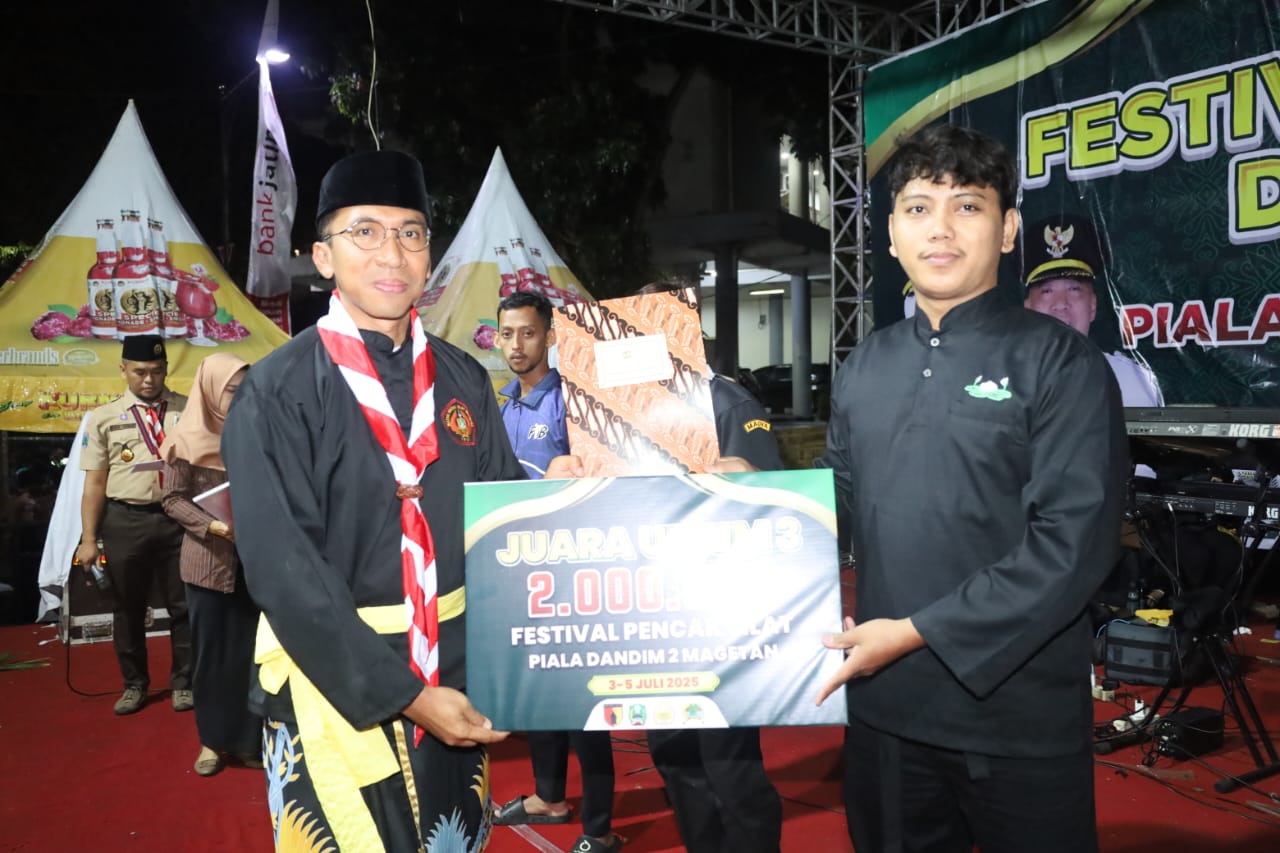 Magetan– Dandim 0804/Magetan Letkol Inf Hasan Dasuki, S.Sos., M.I.P., didampingi Saif Muchlisun, Ketua IPSI sekaligus Kepala DLH Kabupaten Magetan dan Ketua Pengurus Perguruan Pencak Silat se Kab. Magetan secara resmi menutup dan menyerahkan piala dan penghargaan Festival Pencak Silat Piala Dandim Cup II Tahun 2025 sekaligus menutup gelaran Festival Bambu Magetan Djadoel 2025. Festival ini digelar selama 3 hari di GOR Ki Mageti Magetan. Minggu malam (06/07/2025).