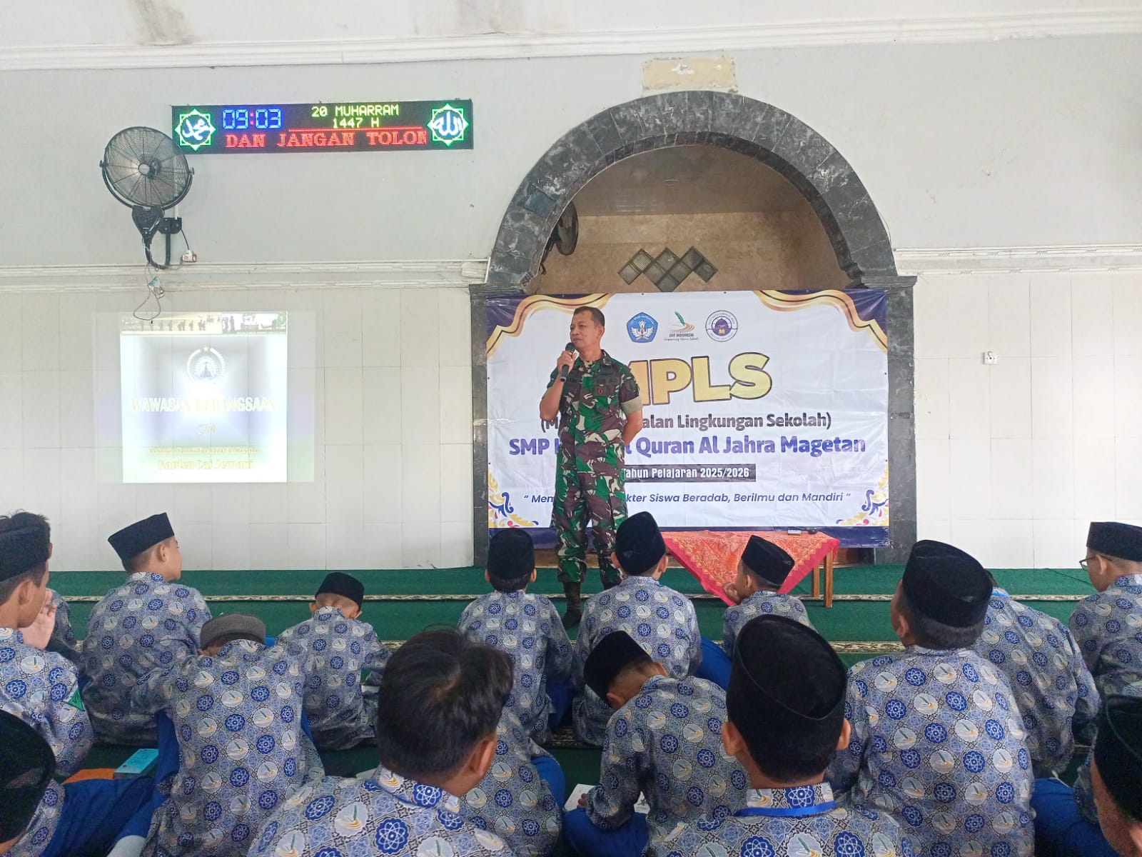 Magetan.- Komandan Koramil 0804/01 Magetan Kodim Magetan Kapten Caj Jemani memberikan materi WASBANG ( Wawasan kebangsaan ) kepada santri di Pondok Pesantren Baitul Qur’an AL Jahra Magetan Jln Raya Magetan-Panekan Kelurahan Tawanganom kecamatan Magetan kabupaten Magetan.Kamis(17-7-2025)