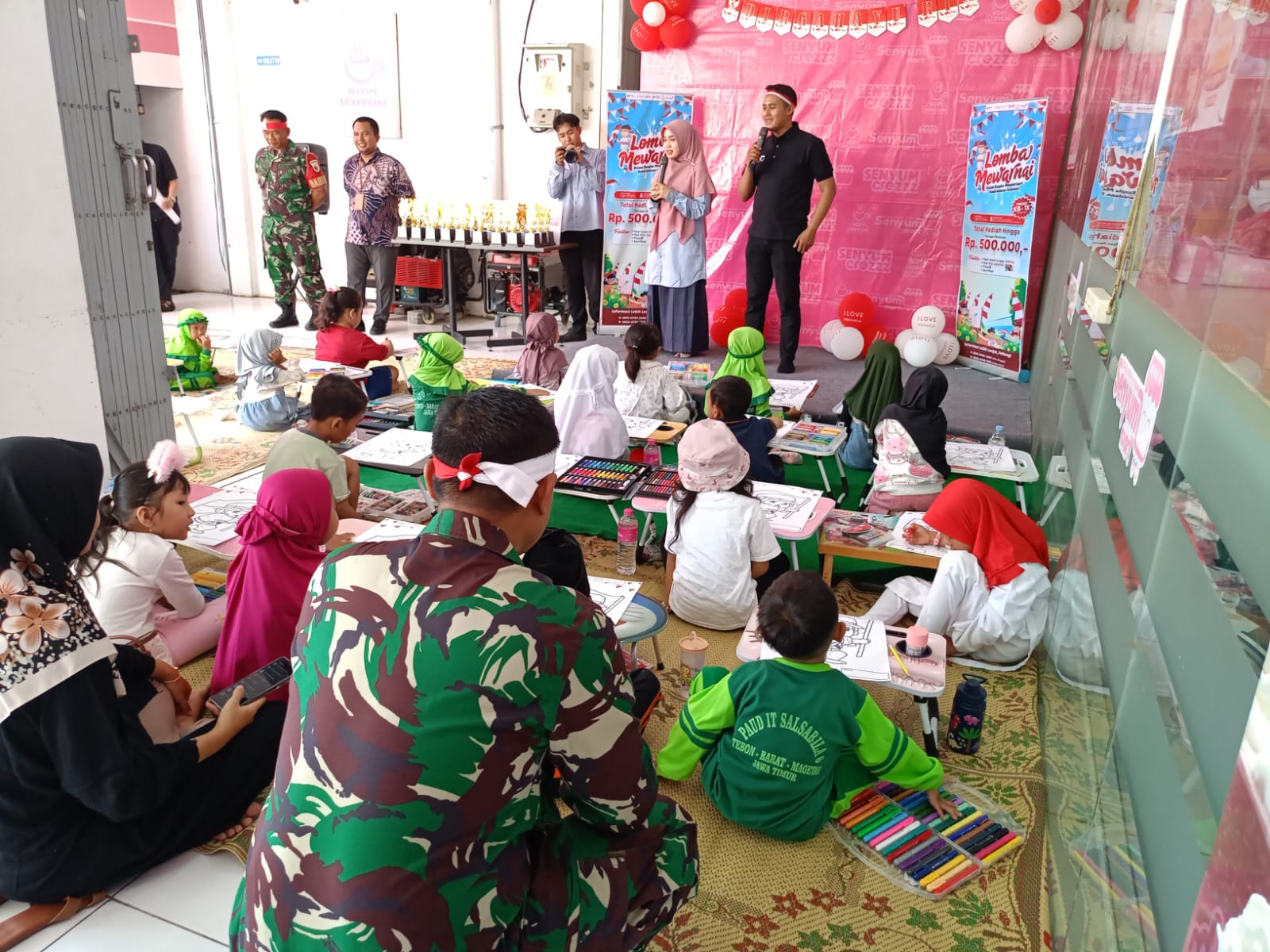 Magetan – Babinsa Koramil Tipe B 0804/08 Barat Serka Sumadi memberikan semangat kepada adik-adik di ajang lomba mewarnai kreativitas anak bangsa bertempat di Kantor KKS Senyum berkah manfaat kelurahan Tebon Rt 03 Rw 02 Kecamatan Barat Kabupaten Magetan, Selasa(19/8/25)