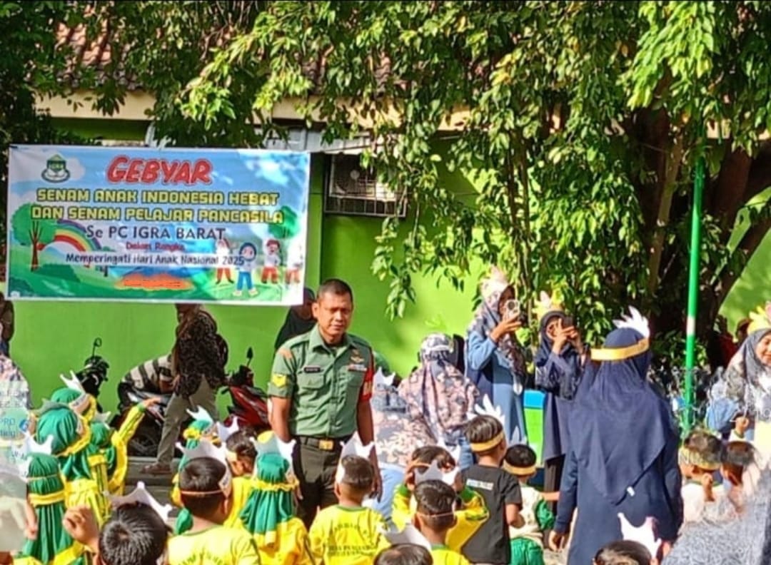 Magetan – Babinsa Koramil Tipe B 0804/08 Barat Serka Juneidi dukungan program pendidikan dan memastikan keamanan, ketertiban di acara gebyar senam anak Indonesia hebat dan senam anak pelajar Pancasila se PC IGRA bertempat di tanam Pancasila kelurahan Tebon kecamatan Barat kabupaten Magetan, Senin (4/8/25)