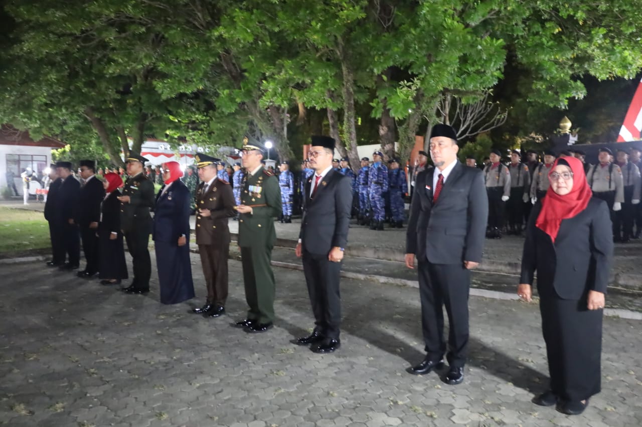 Magetan. Dalam rangka Hut ke-80 Kemerdekaan RI, Dandim 0804/Magetan Letkol Inf Hasan Dasuki, S.Sos., M.I.P., beserta Forkopimda Magetan mengikuti Apel Kehormatan dan Renungan Suci bagi para arwah Pahlawan pejuang kemerdekaan di Taman Makam Pahlawan (TMP) Yudonegoro, Magetan. Sabtu malam (16/8/2025)