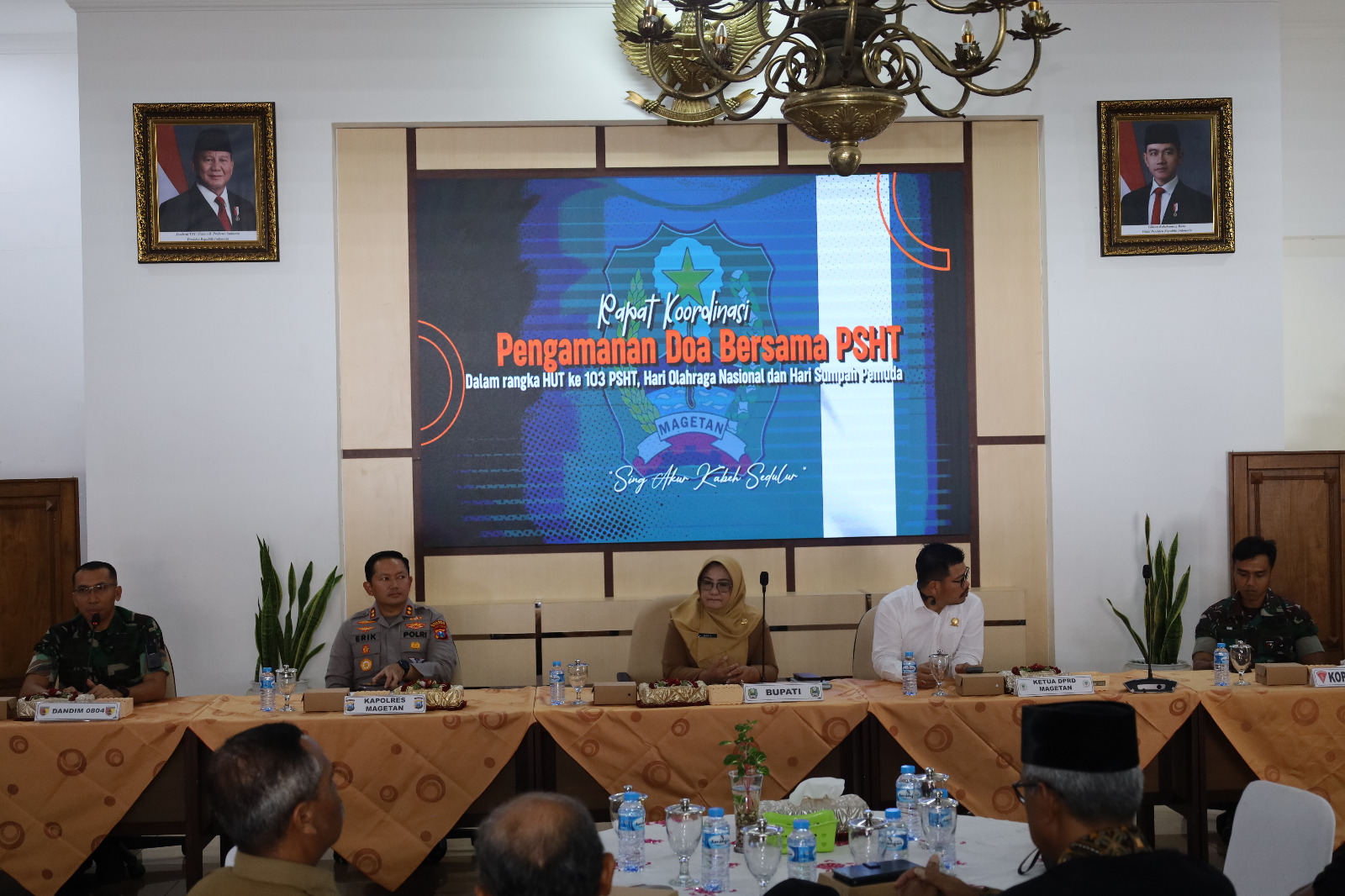 Magetan. – Dandim 0804/Magetan bersama Forkopimda Magetan menghadiri Rapat Koordinasi (Rakor) kesiapan pengamanan dan doa bersama dalam rangka HUT PSHT ke-103, Hari Olahraga Nasional ke-42 dan Peringatan Hari Sumpah Pemuda ke-97 tahun 2025, bertempat di Ruang Jamuan Pendopo Surya Graha, Jl. Basuki Rahmat Selatan No.01 Kabupaten Magetan. Senin (29-09-2025)
