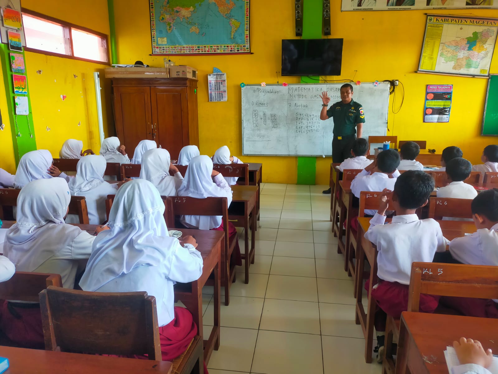 Magetan. – Babinsa desa Baron Koramil Tipe B 0804/01 Magetan Kodim Magetan Sertu Nurdiawan melaksanakan kegiatan Sosialisasi Pengenalan Matematika Dasar Metode Gasing kepada siswa-siswi kelas 4 s.d kelas 6 SDN Candirejo 1 Kecamatan Magetan Kabupaten Magetan.Selasa (07/08/25)