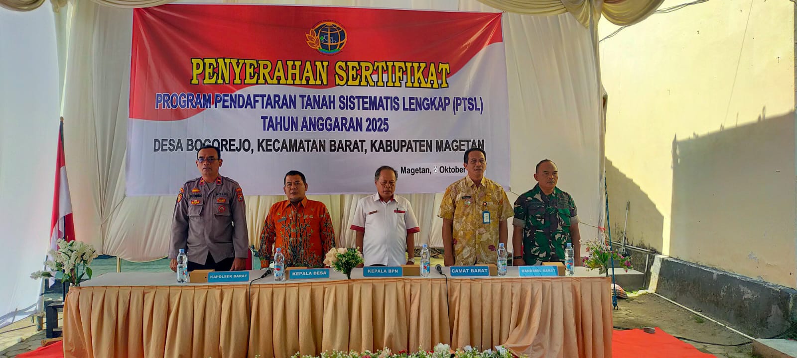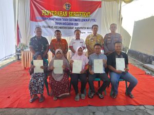 Magetan – Bati Tuud Koramil Tipe B 0804/08 Barat Serma Suwandi berpartisipasi langsung pembagian sertifikat program Pendaftaran Tanah Sistematis Lengkap (PTSL) terlelisasi dengan baik kepada pihak penerima untuk memberikan kepastian hukum atas hak kepemilikan tanah bertempat di Balai Desa Bogorejo, Kecamatan Barat, Kabupaten Magetan. kamis.(9/10/25)