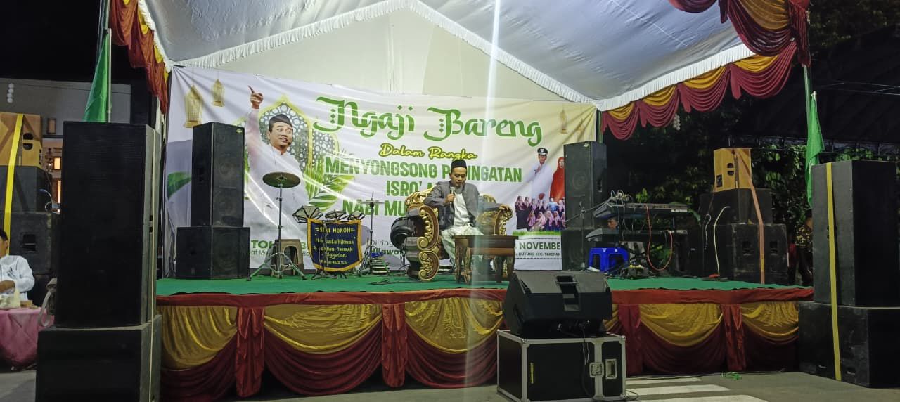 Magetan.- Bintara Tinggi Pembina Perlawanan Wilayah (BATI WANWIL) Koramil 0804/11 Takeran Peltu Sutrisno hadiri Pengajian bersama warga dan Para Tokoh Agama menghadirkan mubaligh pengasuh ponpes salaf mayangkawis Bojonegoro KH Toha Abrori. Dalam rangka menyongsong Isra Mi’raj Nabi Muhammad SAW bertempat di halaman Masjid Baitus sholikin Dsn Lebak Desa Duyung Kec. Takeran Kab. Magetan. Rabu Malam (3/12/2025)